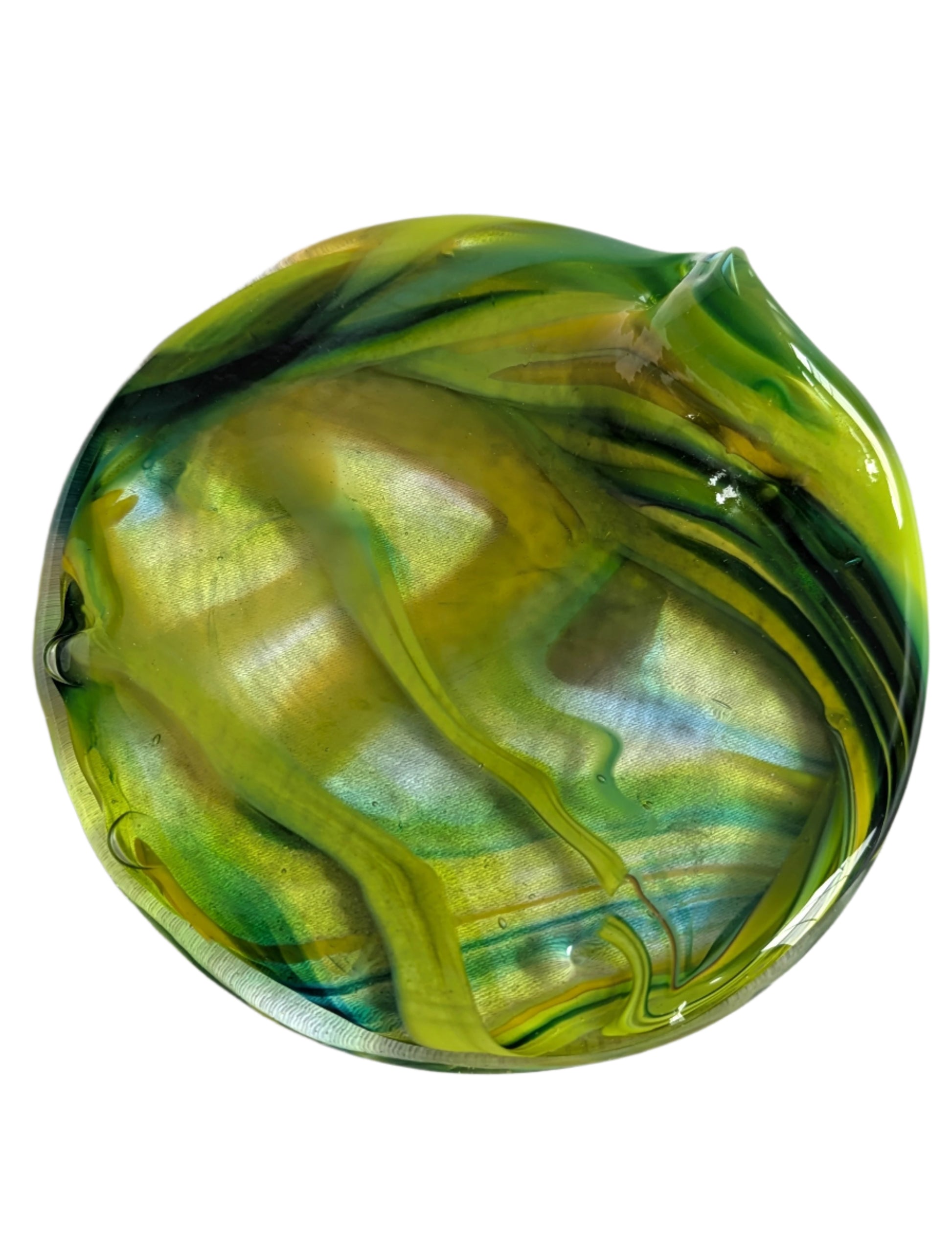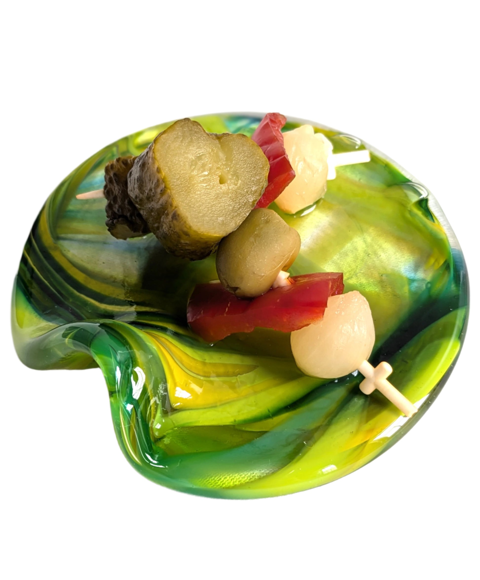Add a touch of artistry to your home with this exquisite artisan-blown glass wavy tray 4.5 in. diam., designed for both decor and serving. Each tray is handcrafted by skilled artisans, featuring fluid, organic curves that create a stunning visual effect. Perfect as a food holder, decor piece, or decorative accent, this unique piece blends elegance with functionality. Measure approx. 4.5" dia.