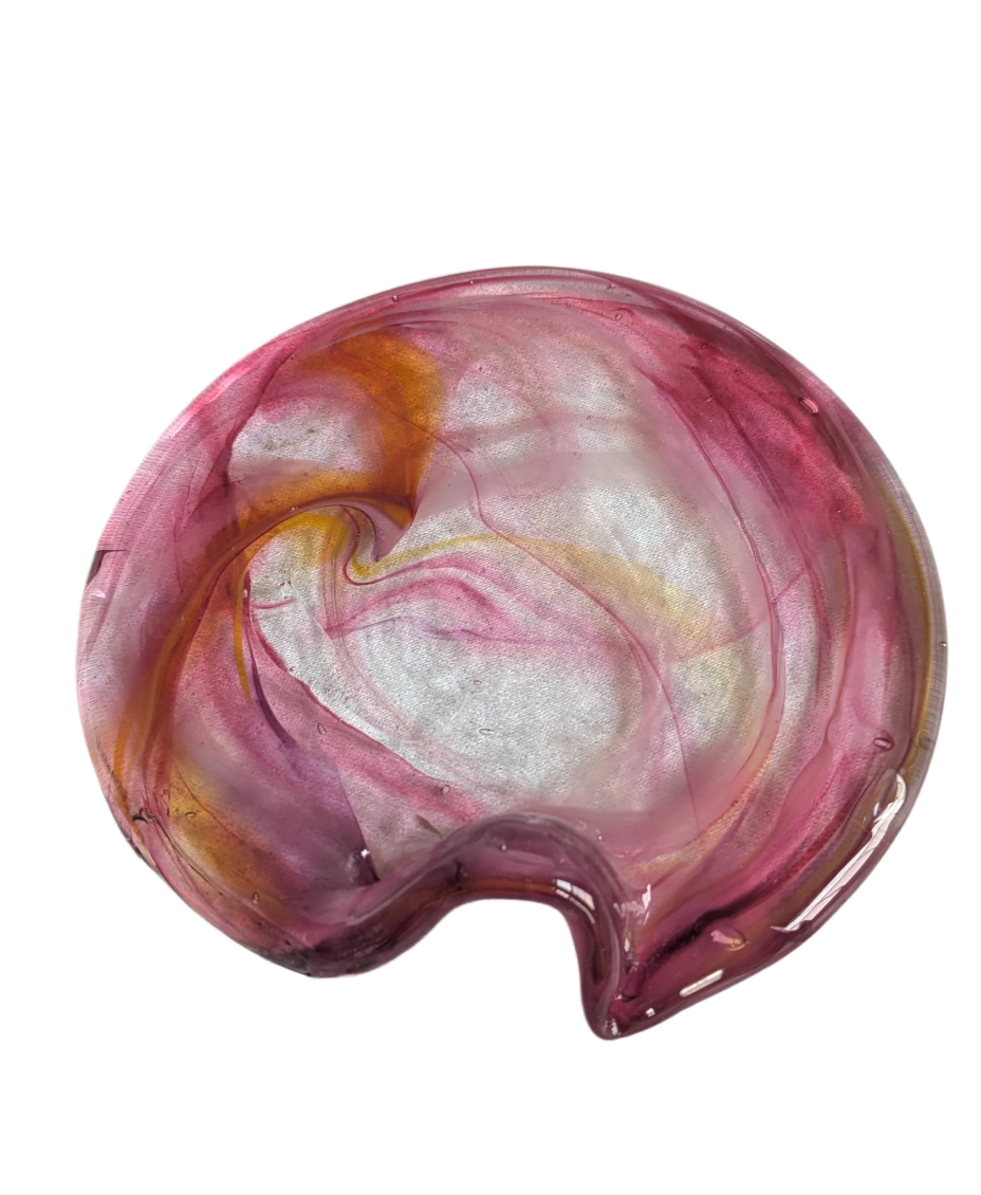 Add a touch of artistry to your home with this exquisite artisan-blown glass wavy tray 4.5 in. diam., designed for both decor and serving. Each tray is handcrafted by skilled artisans, featuring fluid, organic curves that create a stunning visual effect. Perfect as a food holder, decor piece, or decorative accent, this unique piece blends elegance with functionality. Measure approx. 4.5" dia.
