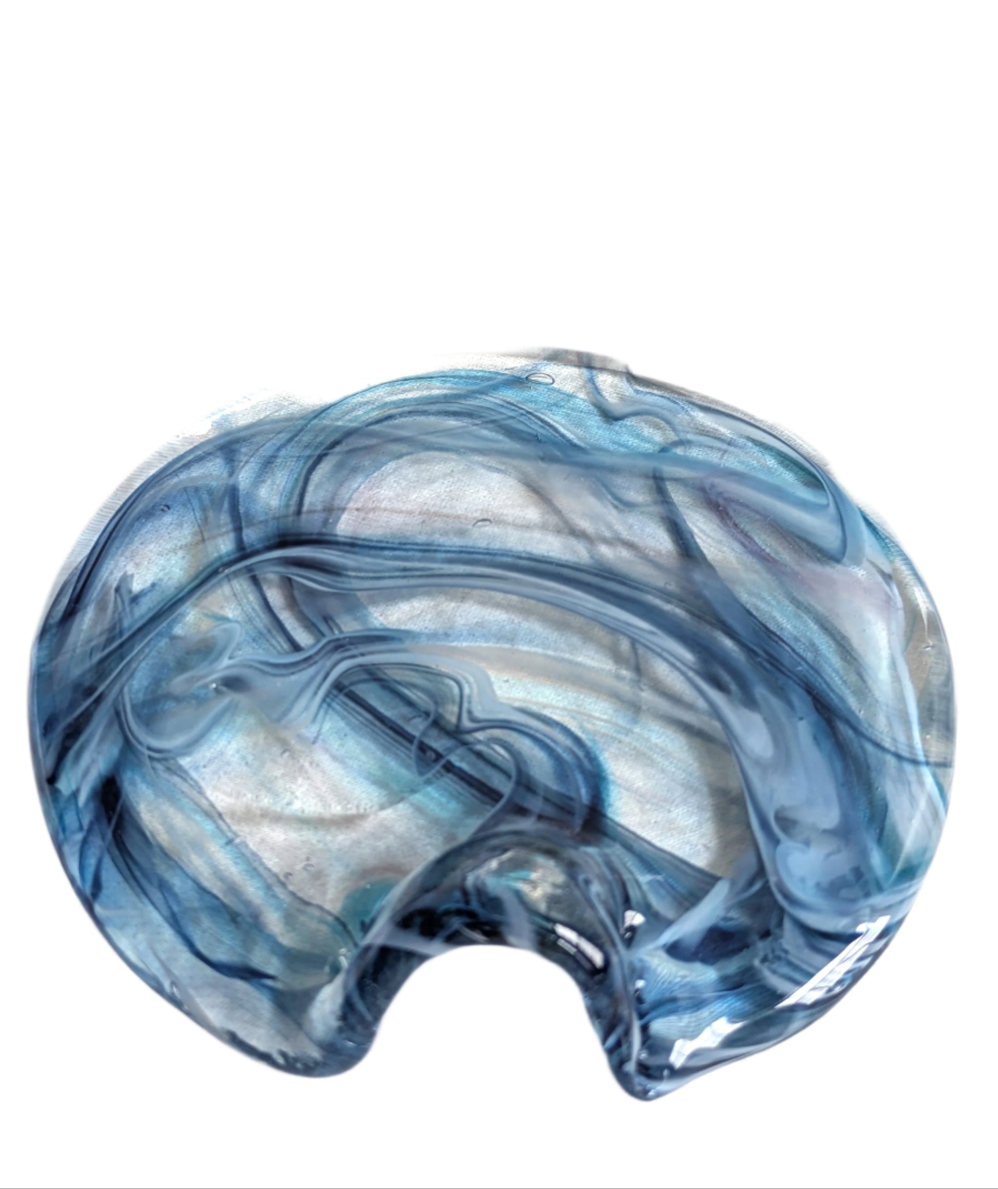 Add a touch of artistry to your home with this exquisite artisan-blown glass wavy tray 4.5 in. diam., designed for both decor and serving. Each tray is handcrafted by skilled artisans, featuring fluid, organic curves that create a stunning visual effect. Perfect as a food holder, decor piece, or decorative accent, this unique piece blends elegance with functionality. Measure approx. 4.5" dia.